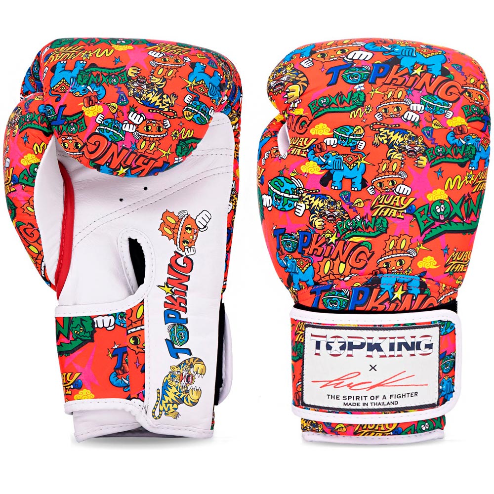 Боксерские перчатки TopKing x Puck - это лимитированная серия, созданная в коллаборации с художником Puck, где яркий комикс-принт на красном фоне со слонами и тиграми превращает экипировку в настоящее шоу. Изделие выполнено из натуральной кожи премиум-класса, что подтверждается специальным клеймом подлинности, причем со временем материал только лучше сохраняет форму и приобретает благородный винтажный вид. Модель представлена в размерной сетке от 8 до 16 унций и имеет на манжете фирменную плашку TopKing x Puck с отметкой: Made in Thailand. Мы доставляем бесплатно все товары, которые Вы видите на нашем сайте.